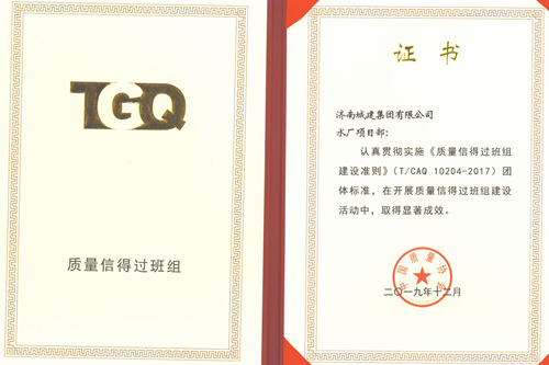 集团水厂项目部荣获中国质量协会“质量信得过班组”