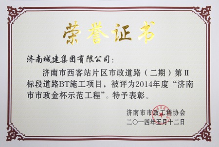 济南市西客站片区市政蹊径(二期)第二标段蹊径BT施工项目被评为2014年度济南市市政金杯树模工程