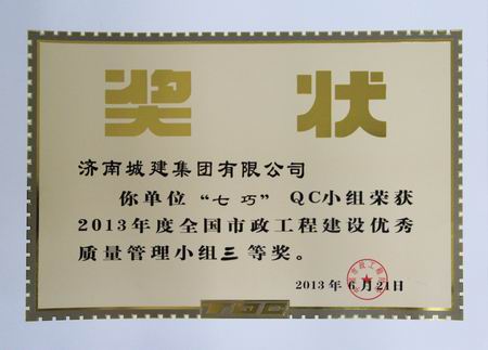 “七巧”QC小组荣获2013年度天下市政工程建设优异质量治理小组三等奖