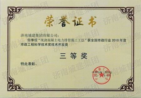 现浇混凝土电力排管施工工法荣获天下市政行业2010年度市政工程科学手艺奖手艺开发类三等奖
