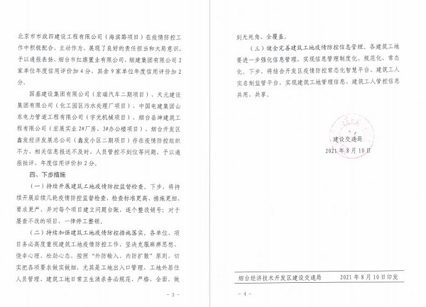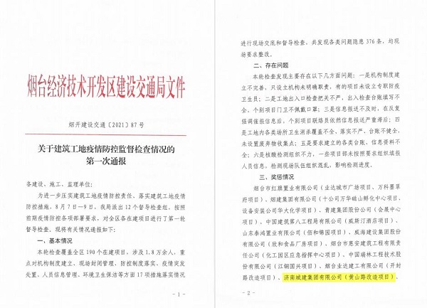 8月10日,烟台开发区建设交通局对一分公司烟台黄山路项目部的防疫事情予以转达表扬,充分一定了项目部在此次防疫事情中的优异体现。
