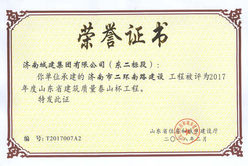 济南市二环南路建设工程(东二标段)被评为2017年度山东省修建质量泰山杯工程