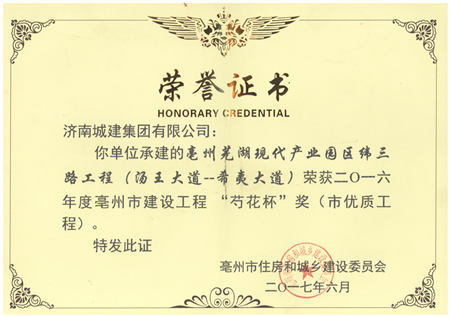 亳州芜湖现代工业园区纬三路工程(汤王大道--希夷大道)荣获2016度亳州市建设工程“芍花杯”奖(市优质工程)