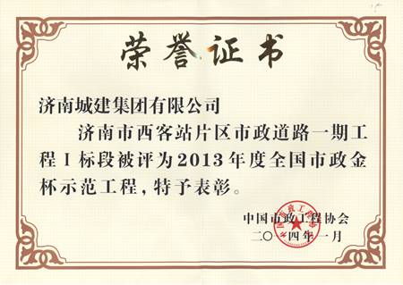 济南市西客站片区市政蹊径一期工程一标段被评为2013年度天下市政金杯树模工程