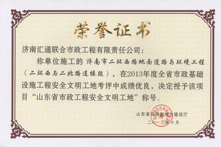 济南市清静路蹊径刷新工程第二标段荣获2013年度山东省市政工程清静文明工地称呼