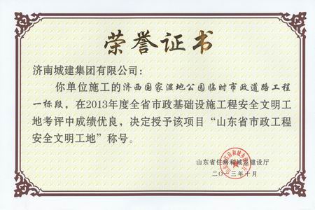 济西国家湿地公园暂时市政蹊径工程一标段荣获2013年度山东省市政工程清静文明工地称呼
