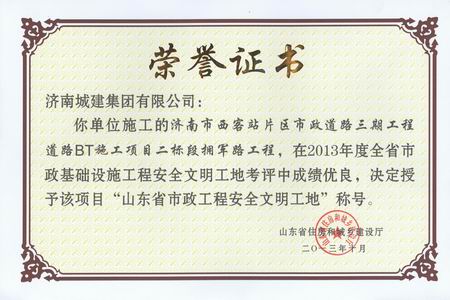 济南市西客站片区市政蹊径三期工程蹊径BT施工项目二标段拥军路工程荣获2013年度山东省市政工程清静文明工地称呼