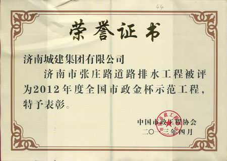 济南市张庄路蹊径排水工程被评为2012年度天下市政金杯树模工程
