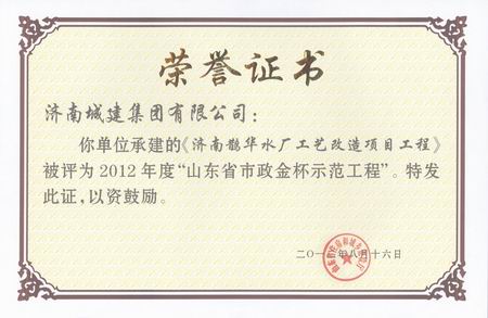 济南鹊华水厂工艺刷新项目工程被评为2012年度山东省市政金杯树模工程
