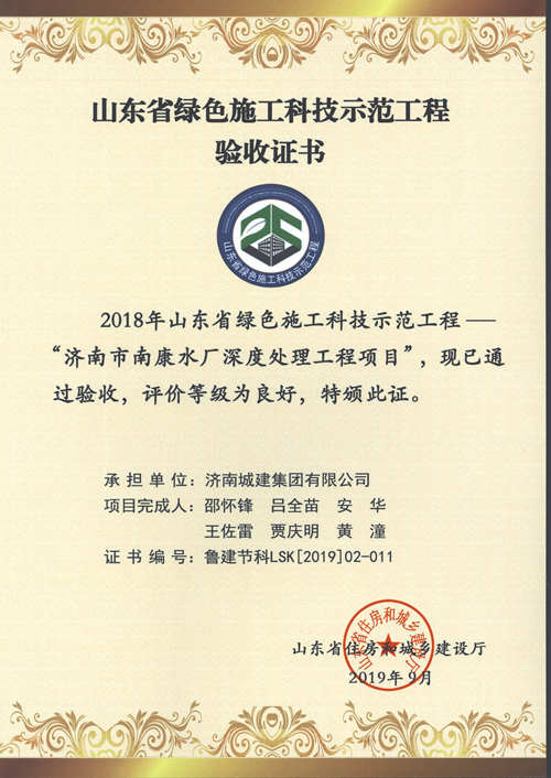 济南市南康水厂深度处置惩罚工程项目被评为2018年山东省绿色施工科技树模工程