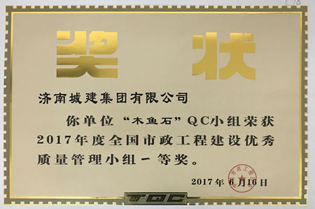 “木鱼石”QC小组荣获2017年度天下市政工程建设优异质量治理小组一等奖