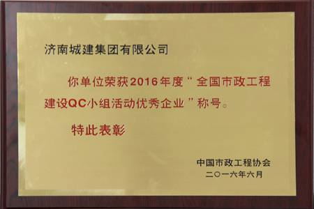 集团荣获2016年度“天下市政工程建设QC小组运动优异企业”称呼