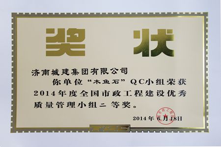 “木鱼石”QC小组荣获2014年度天下市政工程建设优异质量治理小组二等奖