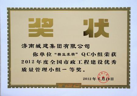 “字斟句酌”QC小组荣获2012年度天下市政工程建设优异质量治理小组一等奖