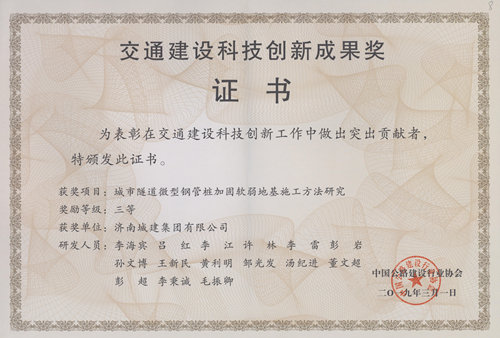集团《都会隧道微型钢管桩加固软弱地基施工要领研究》荣获“交通建设科技立异效果奖三等奖”