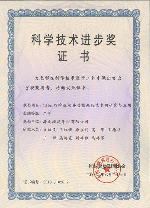 集团《125m四跨一连移动模架新手艺的研究与应用》荣获“科学手艺前进奖二等奖”